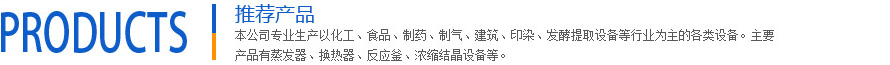 本公司專業(yè)生產(chǎn)以化工、食品、制藥、制氣、建筑、印染等行業(yè)為主的各類設(shè)備。主要產(chǎn)品有發(fā)酵提取設(shè)備,濃縮結(jié)晶設(shè)備,蒸發(fā)器、換熱器、反應(yīng)釜、分離容器、儲罐、熱交換器、冷凝器,全自動供水設(shè)備、不銹鋼裝配式水箱、凝結(jié)水回收等各類壓力容器及非標產(chǎn)品。其中離心式刮板薄膜蒸發(fā)器獲江蘇省優(yōu)質(zhì)產(chǎn)品。